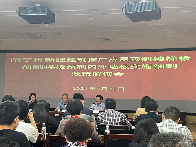 為加深各單位對(duì)推廣應(yīng)用“三板”實(shí)施細(xì)則的了解及應(yīng)用,2021年4月23日,南寧市住房和城鄉(xiāng)建設(shè)局在南寧市住房城鄉(xiāng)建設(shè)局會(huì)議室召開(kāi)了《南寧市新建建筑推廣應(yīng)用預(yù)制樓梯板、預(yù)制樓板、預(yù)制內(nèi)外墻板實(shí)施細(xì)則》政策解讀會(huì),我公司委派技術(shù)部副主任胡興榮參加此會(huì)議。