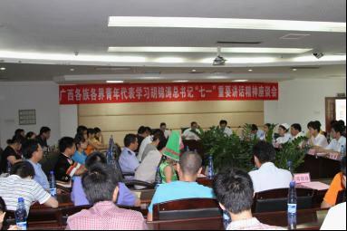 7月2日下午,共青團廣西區(qū)委、廣西青年聯(lián)合會、廣西學(xué)生聯(lián)合會和廣西區(qū)少工委在南寧召開座談會,認(rèn)真學(xué)習(xí)領(lǐng)會胡錦濤總書記在慶祝中國共產(chǎn)黨成立90周年大會上的重要講話精神,并圍繞進一步為黨做好新形勢下的青年群眾工作進行了交流討論。