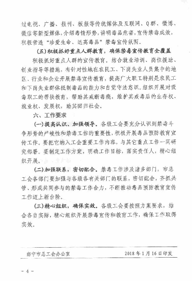 南寧市總工會辦公室關(guān)于印發(fā)《南寧市總工會開展禁毒宣傳教育工作方案》的通知