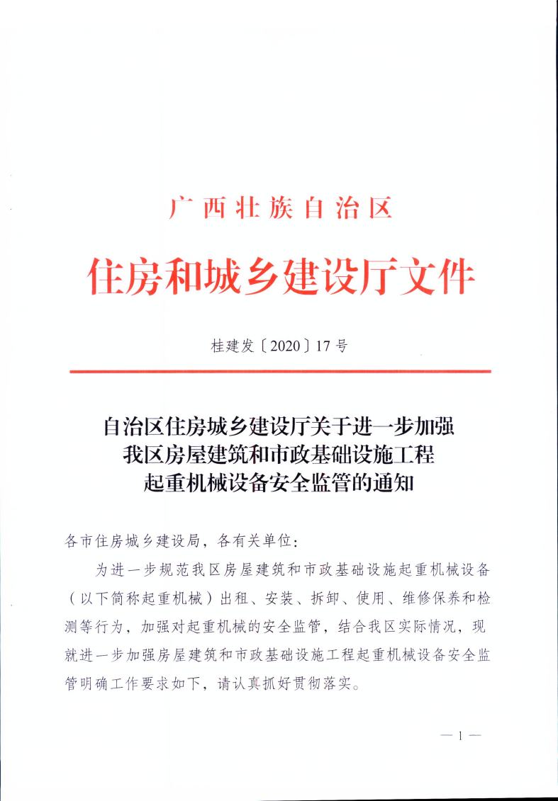 自治區(qū)住房城鄉(xiāng)建設(shè)廳關(guān)于進(jìn)一步加強(qiáng)我區(qū)房屋建筑和市政基礎(chǔ)設(shè)施工程起重機(jī)械設(shè)備安全監(jiān)管的通知— —桂建發(fā)〔2020〕17號(hào)