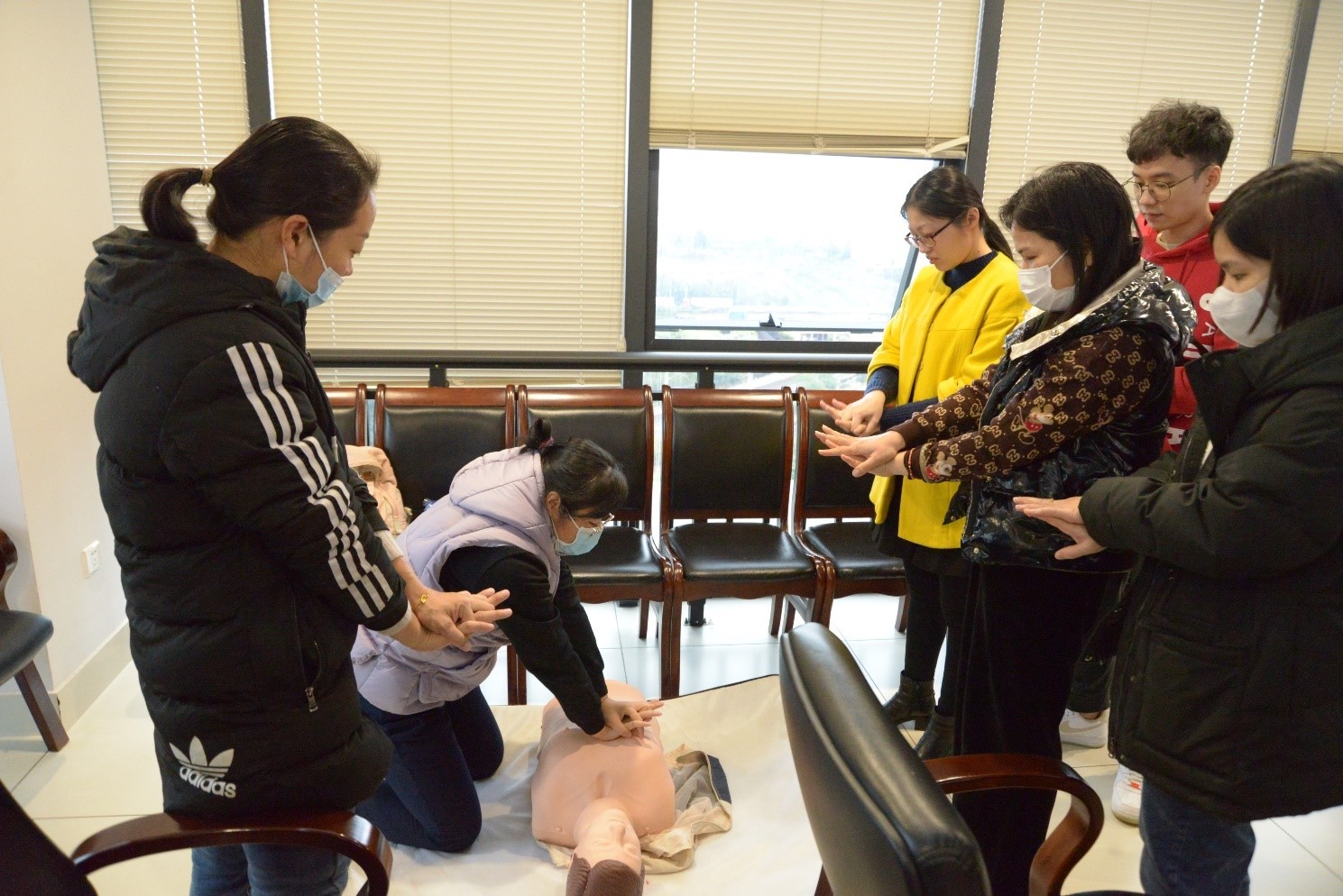 授課現(xiàn)場,培訓老師緊扣應急救護重點,闡述了心肺復蘇(CPR)的理論知識和重要性,系統(tǒng)講解、全程展示啟動應急反應和CPR的全操作流程,操作步驟及注意事項,并使用教具分步演示了如何判斷呼吸、打開氣道以及實施胸外心臟按壓等急救手段,并進一步普及了AED(自動體外除顫儀)的獲取及使用方式,通俗易懂,生動形象。