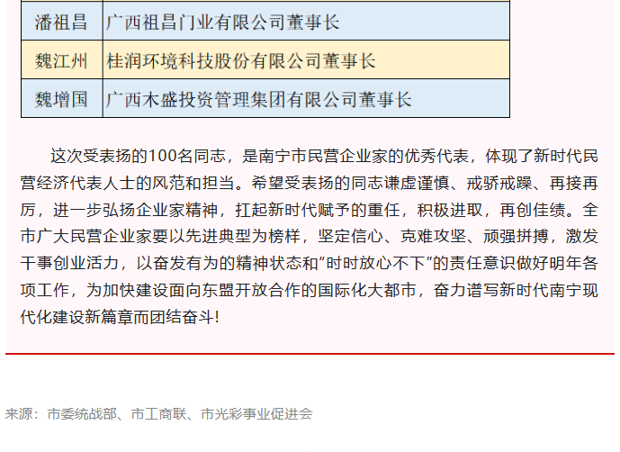 2022年12月30日,南寧市委統(tǒng)戰(zhàn)部、南寧市工商聯(lián)、南寧市光彩事業(yè)促進(jìn)會(huì)決定對(duì)2022年度100位優(yōu)秀民營企業(yè)家進(jìn)行通報(bào)表揚(yáng),共評(píng)出一百名優(yōu)秀民營企業(yè)家。他們是南寧市民營企業(yè)家的優(yōu)秀代表,體現(xiàn)了新時(shí)代民營經(jīng)濟(jì)代表人士的風(fēng)范和擔(dān)當(dāng)。