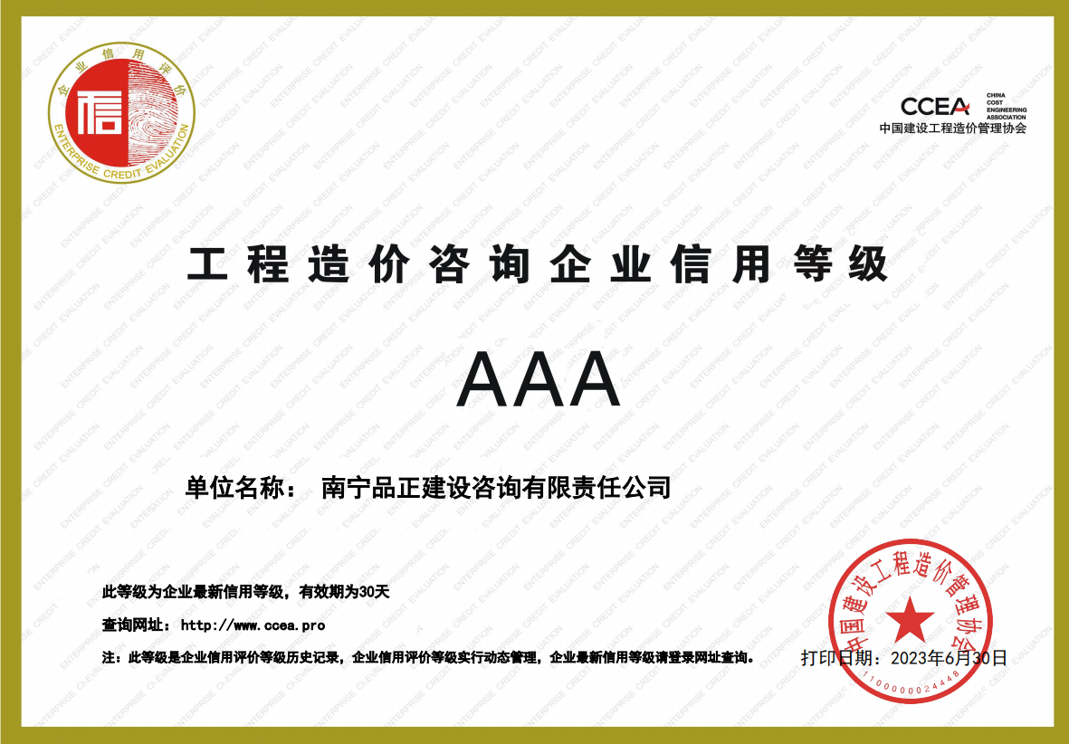 2023年3月至6月,南寧品正建設(shè)咨詢(xún)有限責(zé)任公司參加中國(guó)建設(shè)工程造價(jià)管理協(xié)會(huì)組織的2023年第一批工程造價(jià)咨詢(xún)企業(yè)信用評(píng)價(jià),順利通過(guò)初評(píng)、終評(píng),榮獲中國(guó)建設(shè)工程造價(jià)管理協(xié)會(huì)最高等級(jí)AAA級(jí)信用等級(jí)(中價(jià)協(xié)〔2023〕40號(hào)文),我公司自2017年以來(lái),已經(jīng)連續(xù)6年獲此殊榮。