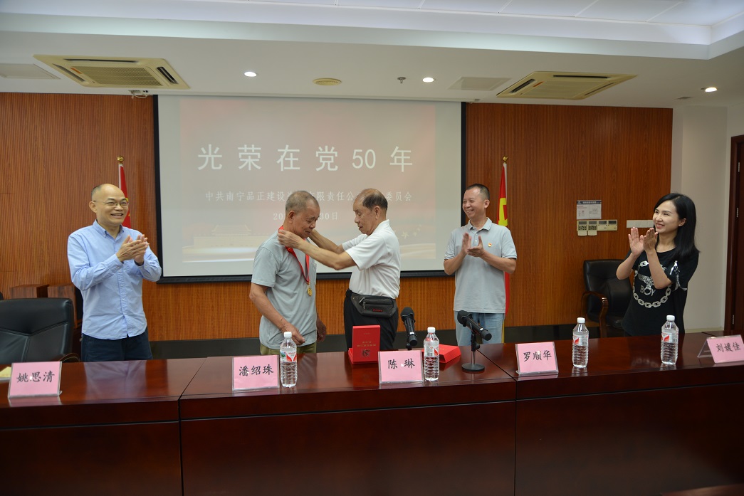 頒發(fā)儀式上,南寧市住建行業(yè)黨委陳琳副書記親手為潘紹珠同志戴上“光榮在黨50年”紀(jì)念章,潘紹珠同志撫摸著閃閃發(fā)亮的紀(jì)念章,激動(dòng)之情溢于言表:“黨的104年華誕,能收到這樣一份特殊的禮物,十分激動(dòng)。這枚沉甸甸的紀(jì)念章,是對(duì)我們老黨員、老同志的最高禮贊......?!?/span>