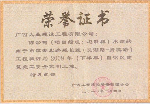 南寧品正負(fù)責(zé)監(jiān)理的廣西農(nóng)科院職工住宅樓(科苑小區(qū))1、2、4、6、8#樓工程、南寧市濱湖北路延長線(長湖路-賢賓路)工程、半島·旺角1#、2#、3#、5#樓及商業(yè)裙樓工程等多個工程分別榮獲市建設(shè)委員會頒發(fā)的“南寧市建設(shè)工程施工現(xiàn)場安全文明工地”稱號。同時,南寧品正負(fù)責(zé)監(jiān)理的南寧-東盟經(jīng)濟(jì)開發(fā)區(qū)D標(biāo)排水主干系統(tǒng)17路段東干渠改造工程也獲得了北海市建設(shè)委員會、北海市建筑業(yè)聯(lián)合會共同頒發(fā)的“北海市建設(shè)工程安全文明工地”稱號。